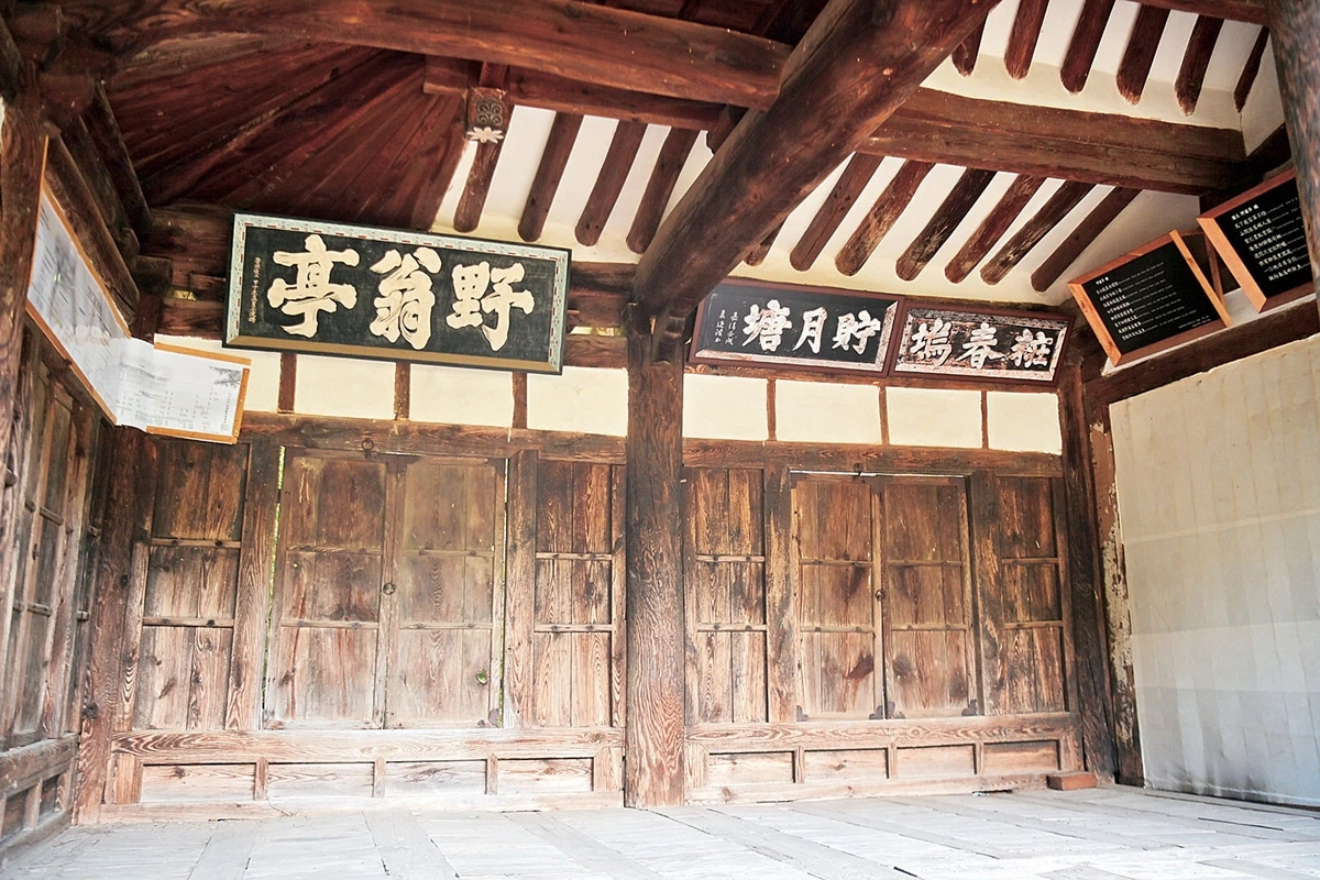 정자의 현판은 모두 네 개. 정자 정면의 예서체로 쓴 글씨가 추사 김정희의 친필이라는데 모사본이다. 원본은 도난당하고 없다. 태백산사고를 시찰하러 왔던 추사가 법전 강씨 집성촌 고택에 머물렀다는데, 이런저런 인연으로 글씨를 받았다고 전해진다. 왼쪽 해서체 글씨는 고종 때 영의정을 지낸 김병국의 글씨다.