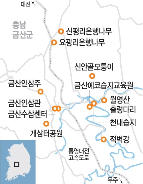 인삼 이야기는 이쯤하고, 금산에 있는 다른 것들을 얘기해보자. 금산에는 금강(錦江)이 있다. 금산과 금강은 짝을 이룬다. 금산이 ‘비단 금(錦)’에 ‘뫼 산(山)’이고, 금강이 ‘비단 금(錦)’에 ‘물 강(江)’이다. 산도, 물도 이름이 다 ‘비단(錦)’이다.